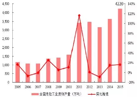 2005~2015全國(guó)危險(xiǎn)工業(yè)廢物產(chǎn)量