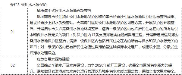 深入推進(jìn)飲用水水源地環(huán)境保護(hù)執(zhí)法專項(xiàng)行動(dòng),加大集中式飲用水水源地保護(hù)區(qū)內(nèi)違章建設(shè)項(xiàng)目的清拆力度,依法查處保護(hù)區(qū)內(nèi)的違法行為。鞏固狼山飲用水水源地環(huán)境問題整治成果,逐步搬遷飲用水源地二級(jí)保護(hù)區(qū)內(nèi)集裝箱及散貨專業(yè)碼頭。排查和依法取締飲用水水源保護(hù)區(qū)內(nèi)的排污口以及影響水源地保護(hù)的碼頭,實(shí)施水源地及周邊區(qū)域環(huán)境綜合整治。定期調(diào)查評(píng)估集中式地下水型飲用水水源補(bǔ)給區(qū)環(huán)境狀況。依法劃定飲用水水源地保護(hù)區(qū),定期開展縣級(jí)以上集中式飲用水水源地環(huán)境狀況調(diào)查評(píng)估,按照“水量保證、水質(zhì)達(dá)標(biāo)、應(yīng)急保障”的要求,加強(qiáng)飲用水水源地及應(yīng)急備用水源達(dá)標(biāo)建設(shè)。對(duì)未達(dá)到Ⅲ類水質(zhì)要求的飲用水水源要制定并實(shí)施水質(zhì)達(dá)標(biāo)方案。加強(qiáng)飲用水水源風(fēng)險(xiǎn)防控體系建設(shè),進(jìn)一步優(yōu)化沿江取水口和排污口布局。強(qiáng)化對(duì)水源周邊可能影響水源安全的制藥、化工、造紙、制革、印染、電鍍、農(nóng)藥等重點(diǎn)行業(yè)企業(yè)的執(zhí)法監(jiān)管。推進(jìn)水廠加速提標(biāo)擴(kuò)能,組織實(shí)施狼山水廠深度處理改造,實(shí)現(xiàn)供好水向供優(yōu)質(zhì)水轉(zhuǎn)變。到2020年,全市基本實(shí)現(xiàn)“雙源供水”。