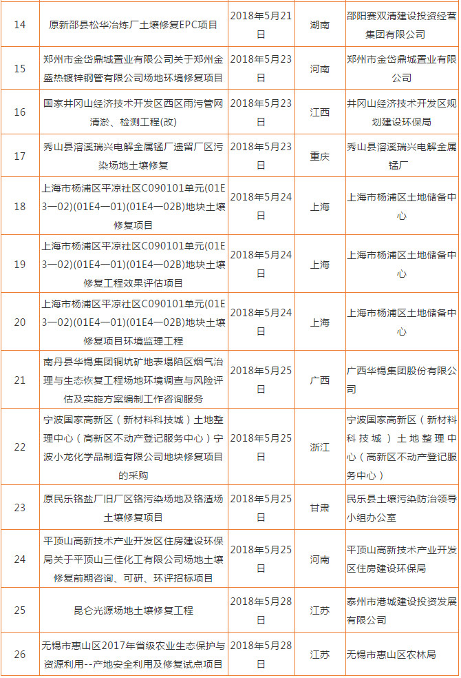 我國(guó)土壤修復(fù)市場(chǎng)前景廣闊,很多土壤修復(fù)項(xiàng)目也在如火如荼地進(jìn)行,5月下旬土壤修復(fù)市場(chǎng)又有哪些項(xiàng)目呢?
