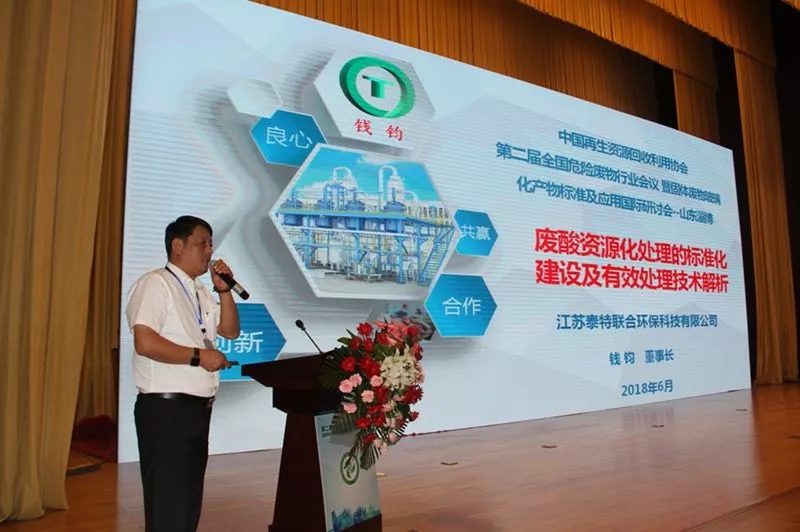江蘇泰特聯(lián)合環(huán)保科技有限公司董事長錢鈞以“廢酸資源化處理的標(biāo)準(zhǔn)化建設(shè)及有效處理技術(shù)解析”為主題,概述了廢酸資源化處理的緊迫性及標(biāo)準(zhǔn)化建設(shè)發(fā)展方向,梳理出涉及到的相關(guān)政策法規(guī),并分享了泰特公司鋼制品鹽酸酸洗廢液的有效處理技術(shù)。