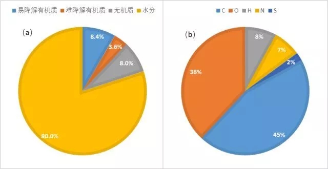 污泥常被認(rèn)為擁有巨大的資源化潛力。然而,無(wú)論從產(chǎn)量還是品質(zhì)上,污泥資源化潛力遠(yuǎn)不如生活垃圾、農(nóng)林廢棄物等大宗廢物。據(jù)國(guó)家統(tǒng)計(jì)局?jǐn)?shù)據(jù),2016年,我國(guó)生活垃圾清運(yùn)量達(dá)2.0億噸,而市政污泥產(chǎn)生量約4000萬(wàn)噸(以80%含水率的脫水污泥計(jì)),扣除水分后,干固體僅800萬(wàn)噸。我國(guó)污泥有機(jī)質(zhì)含量普遍偏低,一般為30~60%,這意味著前述干固體中還有大量缺乏資源化價(jià)值的無(wú)機(jī)質(zhì)。雖然這些無(wú)機(jī)質(zhì)可以用于制建材,但這種方式更適宜稱(chēng)為廢棄物消納而非資源化利用。有機(jī)質(zhì)中,難以生物降解的木質(zhì)纖維素含量約14~30%,腐殖酸含量約10~15%,它們的存在進(jìn)一步降低了污泥生物轉(zhuǎn)化能源的效率。以污泥有機(jī)質(zhì)含量60%為例,脫水污泥成分可以用圖1(a)概括。從污泥干固體元素組成看,其碳含量相遠(yuǎn)低于生物質(zhì)廢物。根據(jù)對(duì)幾十座南方污水廠污泥性質(zhì)的調(diào)查,其平均元素組成如圖1(b)所示,其中碳元素作為多種資源化處理技術(shù)的利用對(duì)象,其比例僅45%。從污泥有機(jī)物組成看,蛋白質(zhì)是主要成分,但其含量不超過(guò)50%,其次是多糖、腐殖酸、脂類(lèi)等。