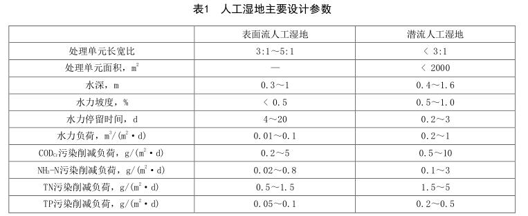 4.4.1.1人工濕地主要設(shè)計(jì)參數(shù)宜根據(jù)試驗(yàn)資料確定,無(wú)試驗(yàn)資料時(shí),可參考表1確定。