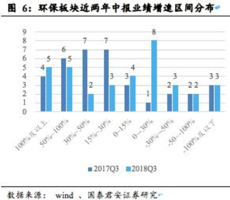 2018年三季度業(yè)績(jī)?cè)鏊倬党^100%的公司分別為華控賽格(539%)、津膜科技(505%)、國(guó)禎環(huán)保(115%)、博世科(107%)、大禹節(jié)水(105%),業(yè)績(jī)下滑程度較大的分別為科融環(huán)境(-2912%)、天翔環(huán)境(-429%)、龍?jiān)醇夹g(shù)(-395%)、永清環(huán)保(-73%)。我們對(duì)于2018年三季報(bào)有業(yè)績(jī)情況的公司取預(yù)告凈利潤(rùn)區(qū)間的平均值或披露值,與2017年前三季度的增長(zhǎng)狀況進(jìn)行比較,發(fā)現(xiàn)2018Q3、2017Q3業(yè)績(jī)?cè)鲩L(zhǎng)的公司數(shù)量分別為19、27家,其中業(yè)績(jī)?cè)鏊僭?0%以上的分別為11、10家,盡管增速50%以上公司數(shù)量基本可以維持,但2018Q3、2017Q3業(yè)績(jī)負(fù)增長(zhǎng)的公司分別為16家、8家,行業(yè)與個(gè)股分化明顯。