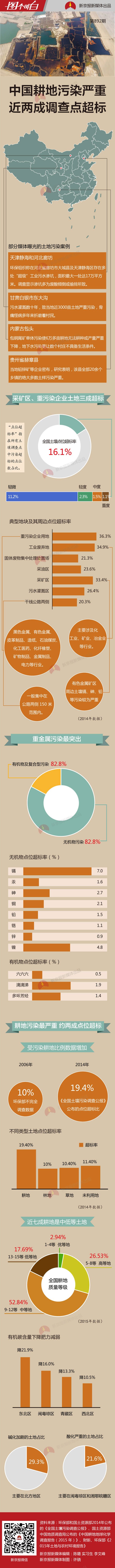 中國土壤污染問題有多嚴重?目前能找到的最權威、最全面的數據來自2014年環(huán)保部和國土資源部共同發(fā)布的《全國土壤污染狀況調查公報》。數據顯示,全國土壤總的超標率為 16.1%,其中最嚴重的耕地,調查點位超標達到19.4%。