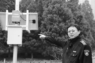 昌平區(qū)環(huán)保局工作人員手指的盒子就是“微站”的核心部件。設(shè)置在昌平公園內(nèi)的這個實時監(jiān)控PM2.5和PM10兩個因子的微型監(jiān)測站,可以實現(xiàn)每一分鐘向系統(tǒng)上傳一次數(shù)據(jù)。 本報記者童克難攝
