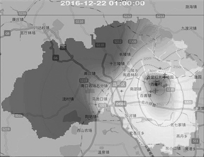 2016年12月22日,北京市發(fā)生重污染天氣過程。昌平區(qū)環(huán)保部門正是通過以上的熱力圖判斷本時間點昌平區(qū)西部地區(qū)的空氣質(zhì)量較好,重污染重點區(qū)域集中在崔村鎮(zhèn),并以此為中心向四周擴散。
