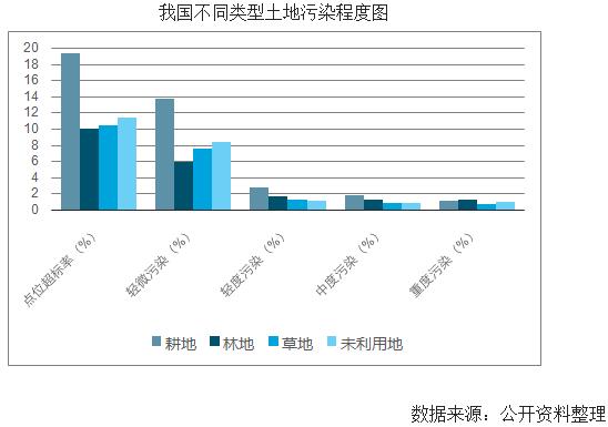 從土地類型來看,耕地的點位超標率最高,達到了19.4%,而其他三種土地的超標率略高于10%的水平。耕地直接涉及到我國的食品安全問題,這也是近年來土地污染問題越來越受到群眾關心的重要原因。