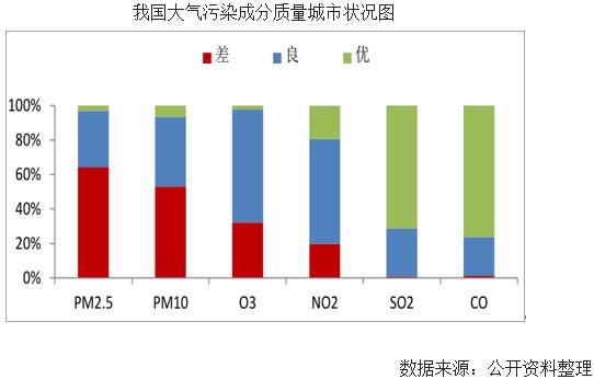 我國大氣污染源主要集中于工業(yè)污染和汽車尾氣,根據(jù)環(huán)境部發(fā)布的《2017年中國環(huán)境狀況公報》,我國338個城市中大氣的主要污染物集中在PM2.5、PM10、臭氧和氮氧化物。其中較為嚴重的是PM2.5和PM10。在統(tǒng)計的338個城市里,這兩項指標差的城市比例高達50%以上。改善空氣質量要從上述4種物質的排放源下手。