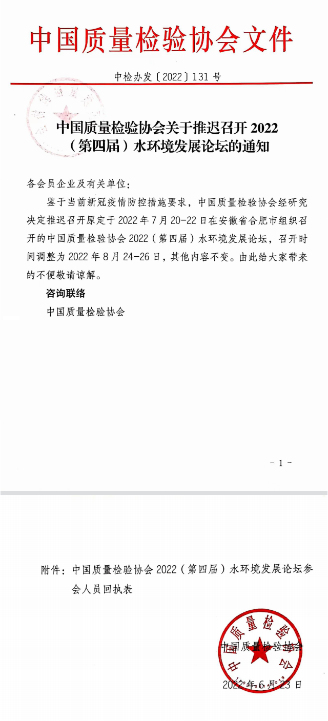 中國質(zhì)量檢驗協(xié)會關(guān)于推遲召開2022(第四屆)水環(huán)境發(fā)展論壇的通知