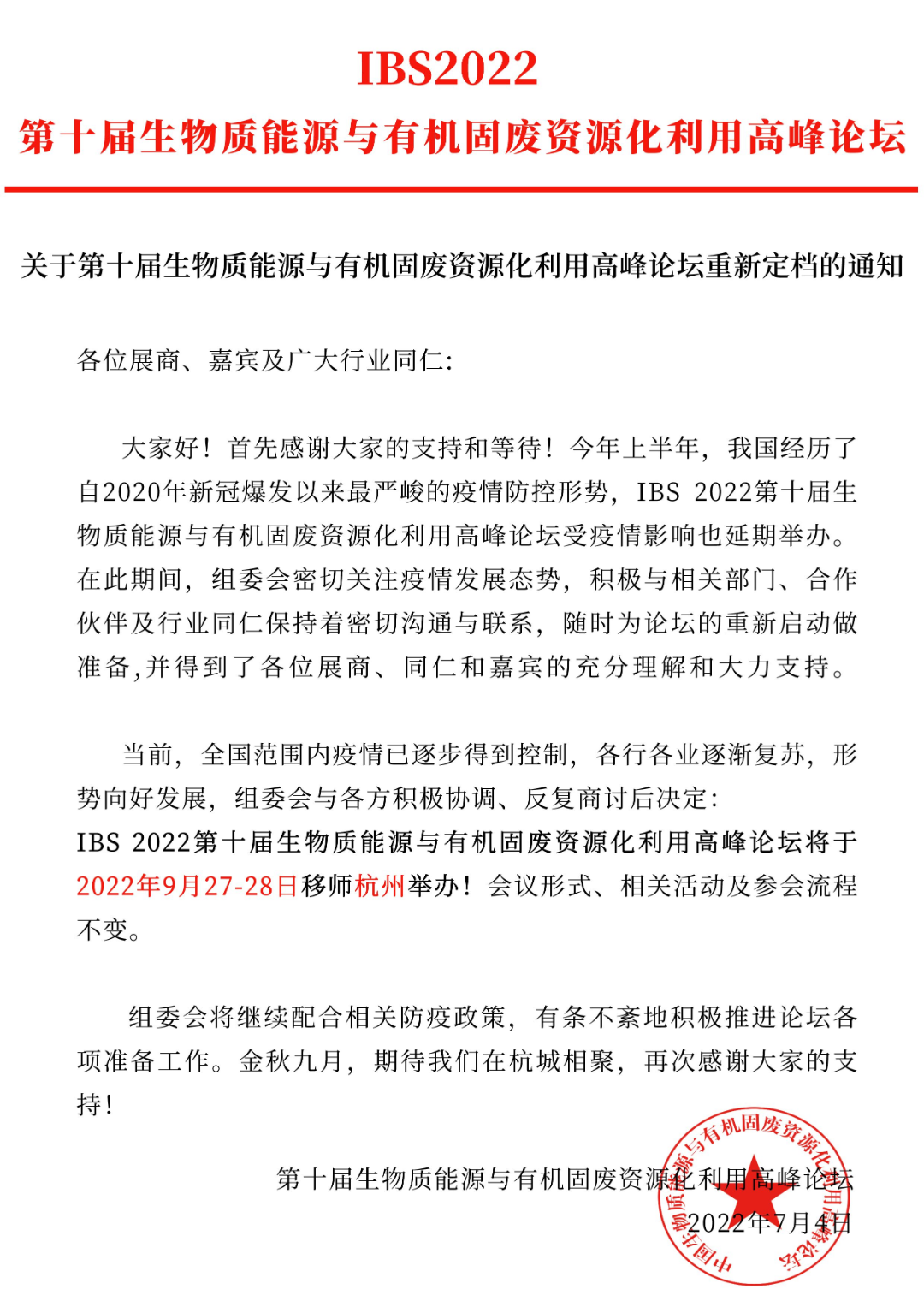 金秋九月,移師杭城——IBS2022第十屆生物質(zhì)能源與有機(jī)固廢資源化利用高峰論壇重新定檔!