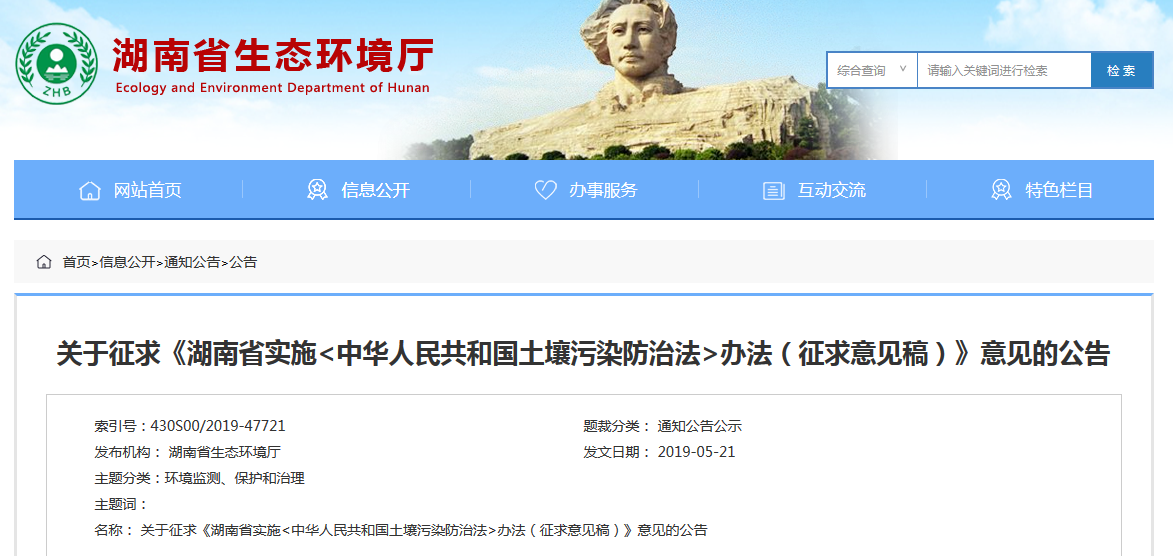 《湖南省實施<中華人民共和國土壤污染防治法>辦法(征求意見稿)》下發(fā)