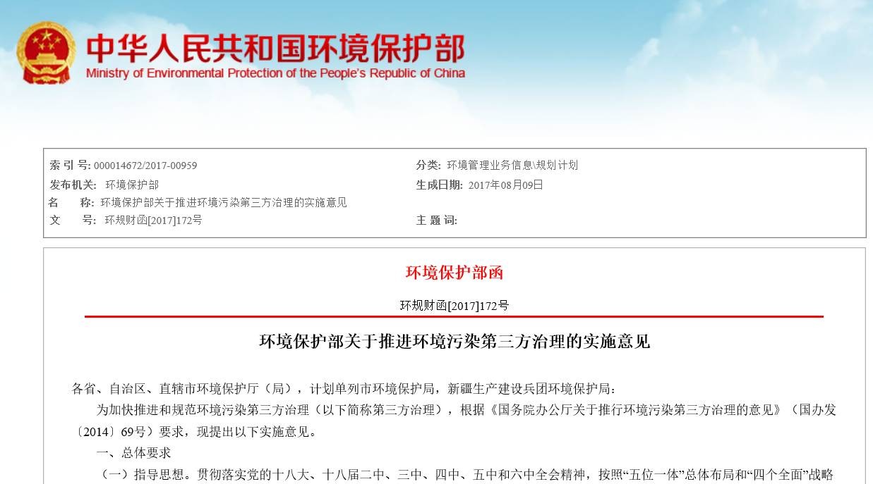 文章導(dǎo)讀 為加快推進(jìn)和規(guī)范環(huán)境污染第三方治理,環(huán)保部發(fā)布《環(huán)境保護(hù)部關(guān)于推進(jìn)環(huán)境污染第三方治理的實(shí)施意見》。文件中,細(xì)化環(huán)境污染第三方治理。劃定第三方責(zé)任,指出第三方治理單位應(yīng)建立臺賬記錄,將構(gòu)建第三方治理信息平臺。企業(yè)污染排放超標(biāo)超總量的,將實(shí)施第三方限期治理。并提出引入第三方支付機(jī)制,依環(huán)境績效...