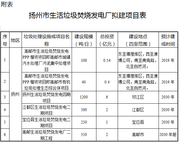 日前揚(yáng)州市人民政府公示了《揚(yáng)州市生活垃圾焚燒發(fā)電廠擬建項(xiàng)目表》,共6個項(xiàng)目,總投資11.94億元,具體內(nèi)容如下:為貫徹國家發(fā)展改革委等五部委關(guān)于《關(guān)于進(jìn)一步做好生活垃圾焚燒發(fā)電廠規(guī)劃選址工作的通知》(發(fā)改環(huán)資規(guī)〔2017〕2166號)精神,提升揚(yáng)州環(huán)境質(zhì)量,提高全市生活垃圾無害化處理能力和資源循環(huán)利...