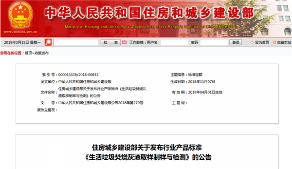 住房城鄉(xiāng)建設(shè)部關(guān)于發(fā)布行業(yè)產(chǎn)品標(biāo)準(zhǔn)《生活垃圾焚燒灰渣取樣制樣與檢測》的公告現(xiàn)批準(zhǔn)《生活垃圾焚燒灰渣取樣制樣與檢測》為城鎮(zhèn)建設(shè)行業(yè)產(chǎn)品標(biāo)準(zhǔn),編號(hào)為CJ/T531-2018,自2019年4月1日起實(shí)施。本標(biāo)準(zhǔn)在住房城鄉(xiāng)建設(shè)部門戶網(wǎng)站(www.mohurd.gov.cn)公開,并由住房城鄉(xiāng)建設(shè)部標(biāo)準(zhǔn)定額研...
