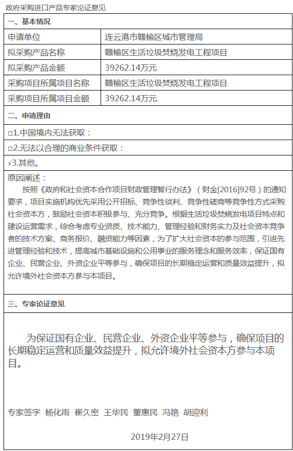 日前江蘇政府采購網(wǎng)發(fā)布了《贛榆區(qū)生活垃圾焚燒發(fā)電工程PPP項(xiàng)目境外社會(huì)資本采購專家論證》,論證意見為,按照《政府和社會(huì)資本合作項(xiàng)目財(cái)政管理暫行辦法》(財(cái)金[2016]92號(hào))的通知要求,項(xiàng)目實(shí)施機(jī)構(gòu)優(yōu)先采用公開招標(biāo)、競爭性談判、競爭性磋商等競爭性方式采購社會(huì)資本方,鼓勵(lì)社會(huì)資本積極參與、充分競爭。根...