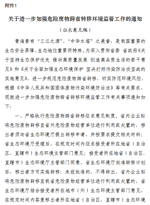 關(guān)于征求《關(guān)于進(jìn)一步加強(qiáng)危險(xiǎn)廢物跨省轉(zhuǎn)移環(huán)境監(jiān)管工作的通知(征求意見稿)》意見建議的函各市(州)生態(tài)環(huán)境局,省固體廢物污染防治中心、省環(huán)境保護(hù)綜合行政執(zhí)法監(jiān)督局,相關(guān)危險(xiǎn)廢物產(chǎn)生、經(jīng)營單位:為強(qiáng)化危險(xiǎn)廢物跨省轉(zhuǎn)移環(huán)境監(jiān)管,切實(shí)防范環(huán)境風(fēng)險(xiǎn),青海省生態(tài)環(huán)境廳草擬了《關(guān)于進(jìn)一步加強(qiáng)危險(xiǎn)廢物跨省轉(zhuǎn)移環(huán)境監(jiān)...