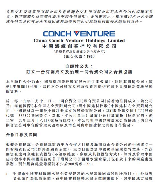 海螺創(chuàng)業(yè)公告,于2019年2月12日,一間合資公司于香港注冊成立,該公司乃由海創(chuàng)國際(公司全資附屬公司)與中國建材控股(中國建材全資附屬公司)共同設(shè)立。于2019年3月18日,公司與中國建材訂立合資協(xié)議,內(nèi)容有關(guān)合資公司事宜的管理及治理以及公司與中國建材之間的合作范圍。根據(jù)合資協(xié)議,合資協(xié)議訂約雙方...