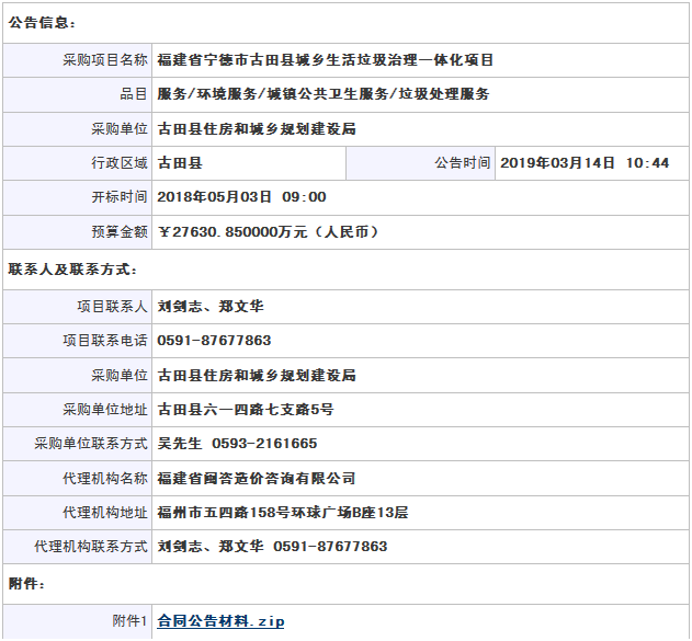 福建省閩咨造價咨詢有限公司受古田縣住房和城鄉(xiāng)規(guī)劃建設局委托,根據(jù)《中華人民共和國政府采購法》等有關規(guī)定,現(xiàn)對福建省寧德市古田縣城鄉(xiāng)生活垃圾治理一體化項目進行其他招標,歡迎合格的供應商前來投標。項目名稱:福建省寧德市古田縣城鄉(xiāng)生活垃圾治理一體化項目項目編號:閩咨招[2018]12號項目聯(lián)系方式:項目聯(lián)...
