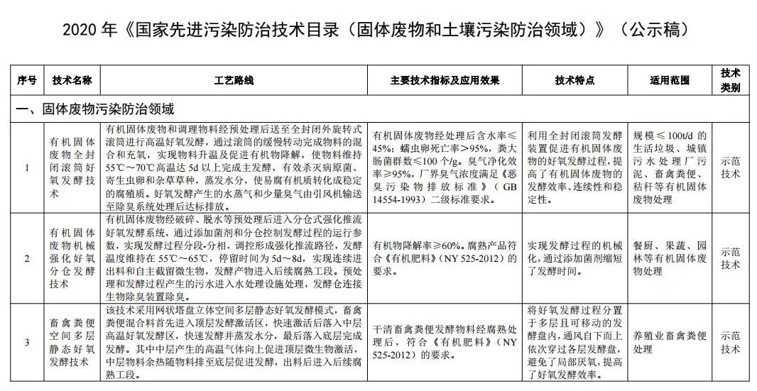 文章導(dǎo)讀日前,生態(tài)環(huán)境部公示《2020年國家先進(jìn)污染防治技術(shù)目錄(固體廢物和土壤污染防治領(lǐng)域)》。詳情如下:關(guān)于《2020年國家先進(jìn)污染防治技術(shù)目錄(固體廢物和土壤污染防治領(lǐng)域)》(公示稿)的公示為貫徹《中華人民共和國環(huán)境保護(hù)法》《中華人民共和國固體廢物污染環(huán)境防治法》《中華人民共和國土壤防治法》,...