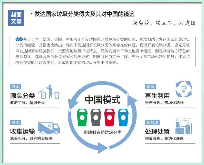 本文亮點(diǎn)在綜述了發(fā)達(dá)國(guó)家垃圾分類開(kāi)展進(jìn)程的基礎(chǔ)上,分析了不同國(guó)家選擇不同分類方式和處理方式的原因,指出了廢物出口導(dǎo)向下發(fā)達(dá)國(guó)家垃圾分類體系存在的問(wèn)題,進(jìn)而總結(jié)了我國(guó)需要吸取的經(jīng)驗(yàn)教訓(xùn),為我國(guó)開(kāi)展垃圾分類提出了建議。內(nèi)容簡(jiǎn)介及結(jié)論近年來(lái),我國(guó)不斷推進(jìn)垃圾分類工作的深入開(kāi)展,46個(gè)重點(diǎn)城市已逐步建成垃圾...