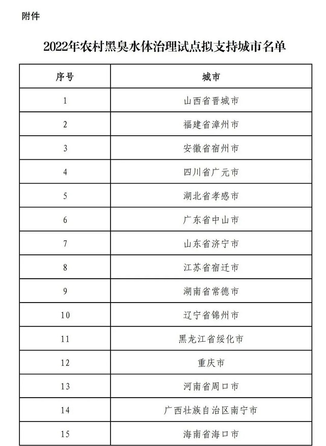按照《財政部辦公廳 生態(tài)環(huán)境部辦公廳關于開展2022年農(nóng)村黑臭水體治理試點工作的通知》(財辦資環(huán)〔2022〕5號)要求,財政部會同生態(tài)環(huán)境部組織專家對各地農(nóng)村黑臭水體治理申報城市實施方案進行了競爭性評審。根據(jù)競爭性評審結(jié)果,擬將15個城市確定為2022年支持的農(nóng)村黑臭水體治理試點城市(詳見附件)。 ...
